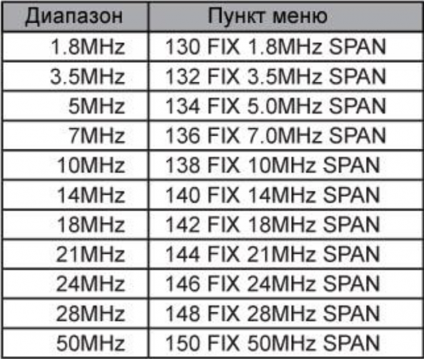 Полоса обзора для режима «FIX» назначается равной 20/50/100/200/500 и 1000 кГц независимо для каждого из диапазонов и выбирается в соответствующих пунктах меню установок, показанных в таблице ниже.