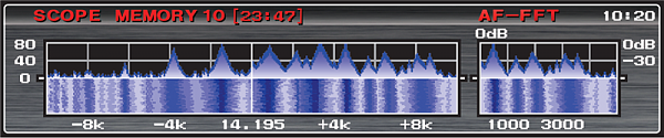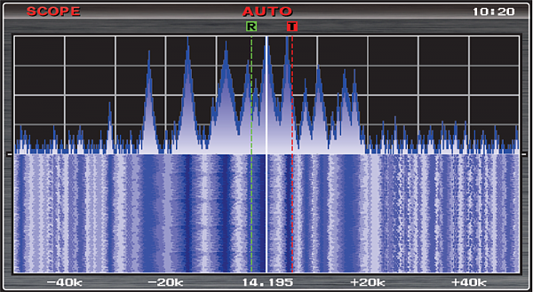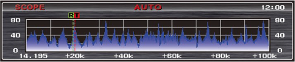 При нажатии на кнопку [AUTO], расположенной на передней панели трансивера происходит отображение спектра принимаемого сигнала в режиме реального времени. При этом УНЧ трансивера отключается. С помощью кнопки [SCOPE] можно выбрать три режима отображения графической информации: