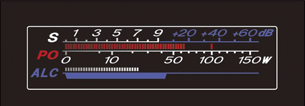 Дополнительно можно выбрать вид основного многофункционального индикатора: в виде традиционного стрелочного прибора или в виде пикового индикатора. Хотя отображение в виде гистограммы включает в себя традиционные показания S-метра и выходной мощности передатчика, но в случае необходимости можно включить отображение одного из параметров: уровень ALC, КСВ, ток стока выходных транзисторов, напряжение питания или уровень компрессии речевого сигнала. Это является дополнительным удобством, например, при настройке усиления микрофона или проверки работы УМ в режиме передачи.