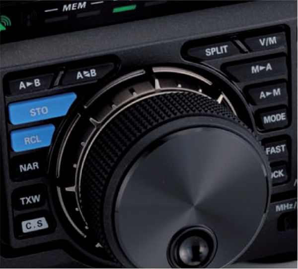 Массивная ручка основной настройки имеет диаметр 50 мм. Она плавно и легко вращается, имеет удобную выемку под палец, наружный фиксатор усилия вращения и при вращении изменяет рабочую частоту VFO-A. Вращение этой ручки по часовой стрелке обеспечивает увеличение показания частоты, а вращение ручки настройки против часовой стрелки её уменьшение. Нажатие кнопки [LOCK] приводит к блокировке перестройки частоты. Требуемый шаг настройки выбирается в меню установок трансивера. Для каждого вида излучения предусмотрено два типа шага настройки: «обычный» и «быстрый». «Быстрый» шаг настройки включается кнопкой [FAST]. Для режимов SSB, CW, RTTY, DATA шаг настройки выбирается равным 1/5/10 Гц и 100 Гц (когда нажата кнопка [FAST]). Для режимов АМ и ЧМ шаг настройки будет соответственно 100 Гц и 1 кГц. По умолчанию для режимов SSB и CW установлен шаг настройки 10 Гц, для RTTY и DATA он соответствует 50 Гц, а для режимов АМ и ЧМ – 100 Гц.