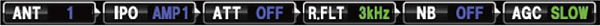 - Обычный режим (отображается S-метр, спектроскоп, выбранная антенна (ANT 1/ ANT 2), предусилители (AMP 1, AMP 2 или режим оптимизации точки пересечения (IPO)), руфинг-фильтры R.FLT (3 кГц, 6 кГц, 15 кГц), нотч-фильтр (NB OFF, NB ON, NBW ON), АРУ (SLOW, MID, FAST), индикатор расстройки (CLAR), индикатор антенного тюнера, пиктограммы фильтров (CONTOUR, WIDTH, NOTCH, SHIFT), дополнительное окно AF-FFT, текущее время) и т.д.