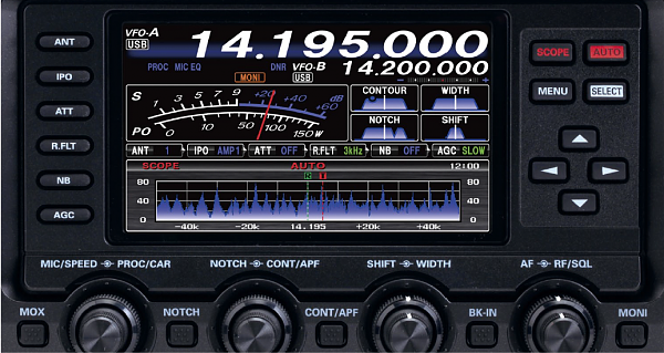 Выведение всей необходимой информации на дисплей трансивера было тщательно продумано. В его центральной части показаны все наиболее важные параметры и установки, включая рабочие частоты приема и передачи. Вспомогательные окна (CONTOUR, WIDTH, NOTCH, SHIFT), в которых отображены другие функции, расположены справой стороны от них, а окна спектроскопа, меню и AF-FFT – снизу. Вся отображаемая информация располагается в поле зрения оператора, благодаря чему появилась возможность, не отвлекаясь от эфира осуществлять непрерывный визуальный контроль своих действий. Кнопки и ручки ряда функций SHIFT, WIDTH, NOTCH и CONTOUR (APF) находятся непосредственно под ЖК-дисплеем. Это преимущество значительно повышает оперативность при работе в условиях соревнований или работы с DX. Более того, различный цвет свечения соответствующих надписей индицирует включение или отключение той или иной функции, что позволяет оператору интуитивно и без затруднений контролировать текущий режим работы трансивера.