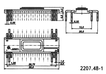 Назначение выводов: 1 - выход 4; 2 - выход 5; 3 - выход 6 (младший разряд); 4 - тактовый сигнал; 5,43 - общий (цифровая земля); 8,39 - напряжение питания Uп1; 9 - опорное напряжение Uоп2; 10,13,15 - вход (аналоговый сигнал); 11,14 - общий (аналоговая земля); 12 - вывод корректировки нелинейности; 16 - опорное напряжение Uоп1; 24,37,38 - напряжение питания -Uп2; 44 - управление выходным кодом, вход 1 (УКВ1); 45 - выход 1 (старший разряд); 46 - выход 2; 47 - выход 3; 48 - управление выходным кодом, вход 2 (УКВ2); 6,7,17...23,25...36,40...42 - свободные. |