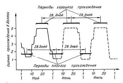 Есть еще один метод прогнозирования периодов плохого (или хорошего) прохождения на более длительный срок, чем несколько дней. Суть его заключается в следующем.