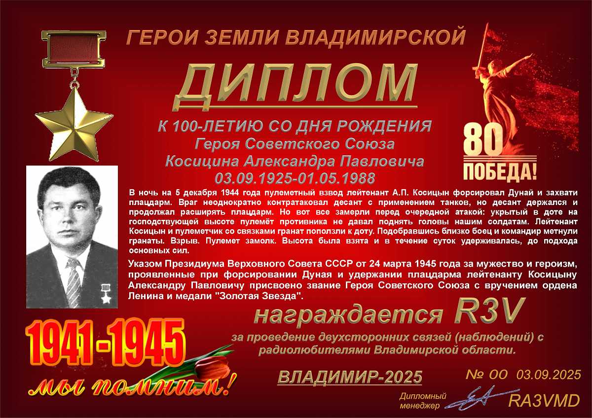 Диплом учрежден Владимирским областным радиоклубом и посвящен 100-летию со дня рождения Героя Советского Союза Косицына Александра Павловича – командира пулемётного взвода 1077-го стрелкового полка 316-й стрелковой дивизии 46-й армии 2-го Украинского фронта, лейтенанта.