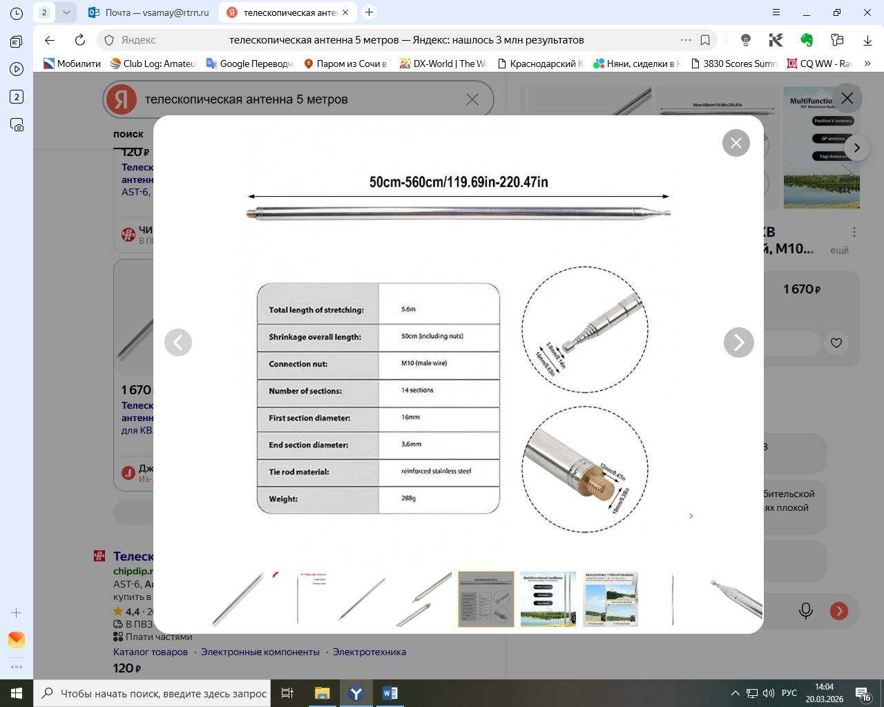 Телескопическая дипольная антенна на любой диапазон, от 6-20 метров. В сложенном состоянии 113см. В полностью выдвинутом положении 1050см. Максимальный Ф трубки телескопа 16мм, минимальный Ф 3, 6мм. Материал нержавейка. Концы элементов провисают около 80см. Установлен разъем SO-239.