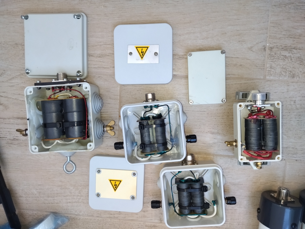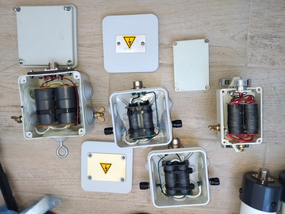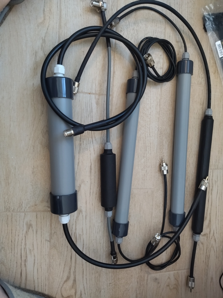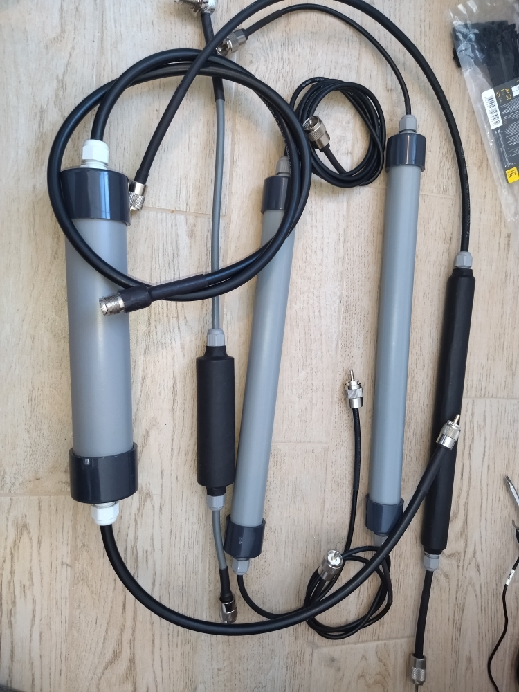 Антенная мачта армейского образца времен СССР из 6 секций разделенных фарфоровыми изоляторами. Растяжки грозоразрядники в комплекте