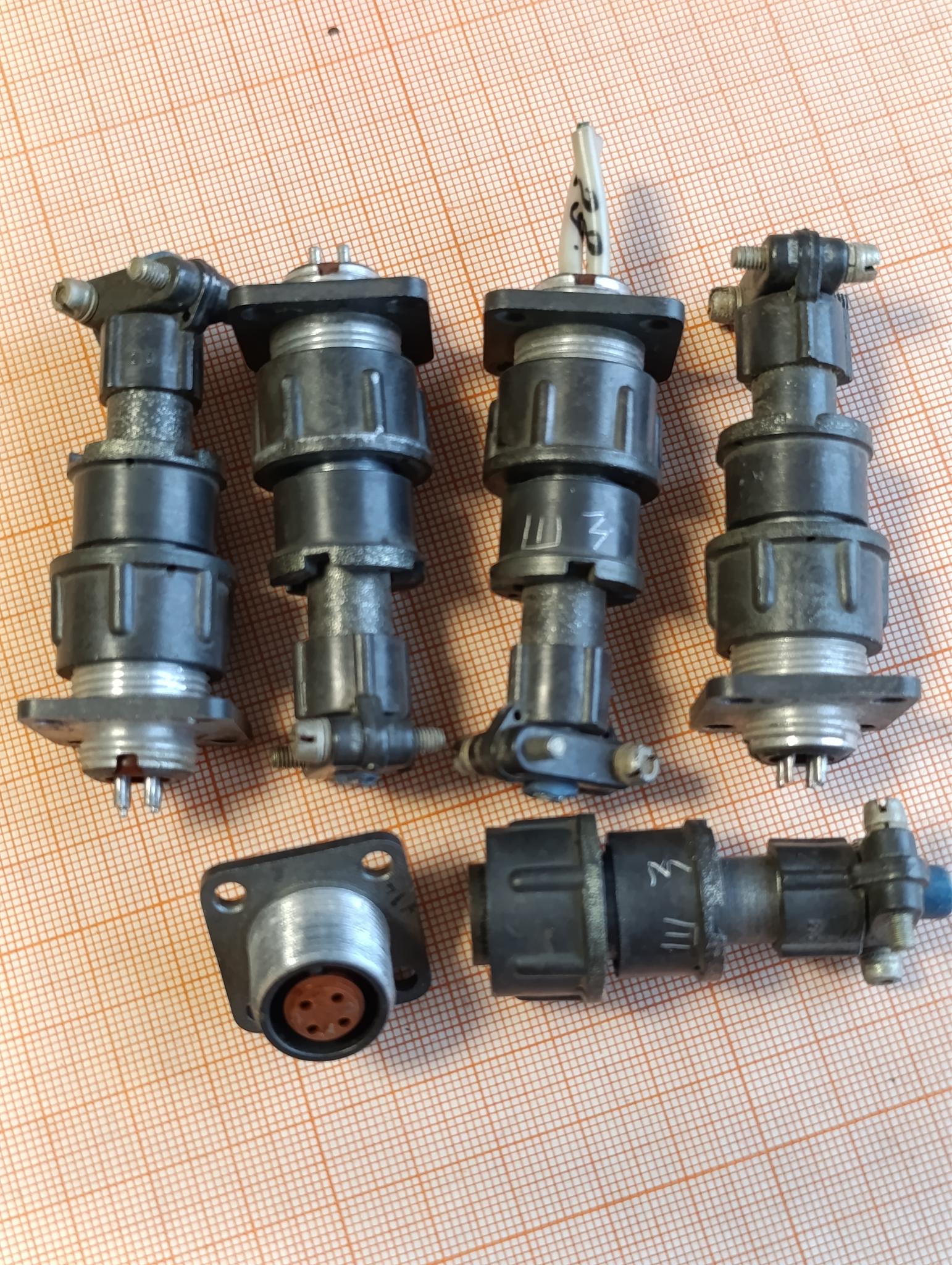 Предлагаю разъёмы в комплекте: МРН-14 1шт. б/у, МРН-22 1шт. б/у., следующие с хранения: ГРПМ-31 1шт., ГРП-36 1шт., ГРПМ-61 1шт., розетка ГРПМ3-36 1шт., комплект РШ2Н-2 и РГ1Н-2 21 контакт не б/у.