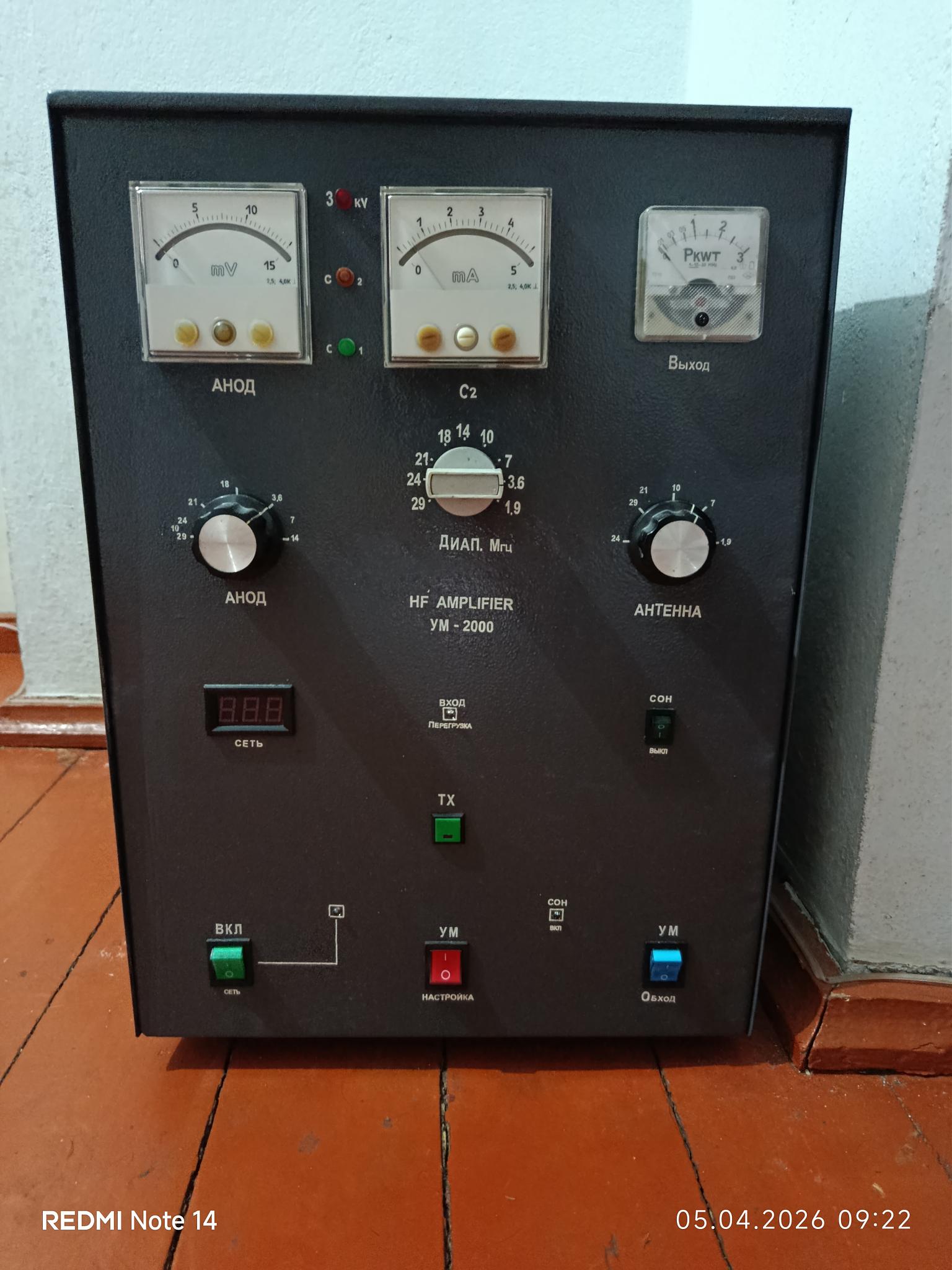 ум девяти диапазонный 10м, 12м, 15м, 17м, 20м, 30м, 40м, 80м, 100м. мощность на выходе-10 и 12м-1000ват на остальных диапазонах 1500ват и выше. На входе 10-25 ват, лампа в работе не была, правильно востановленна, динатрон исключён, трансформатор высоковольтный отдельно, тор 4000 ват ум без транса де ...