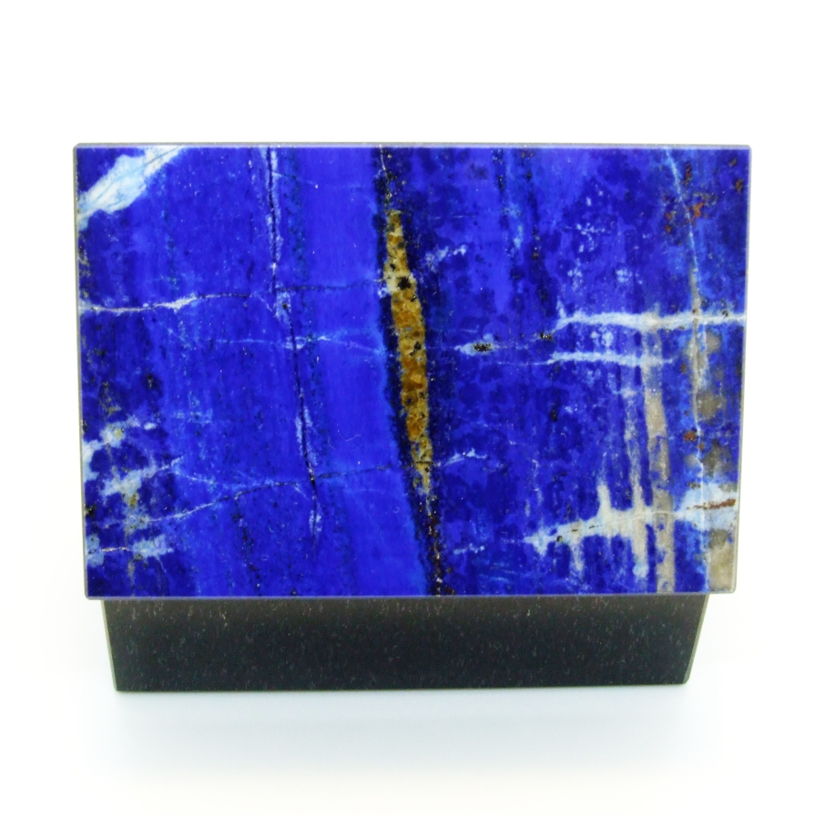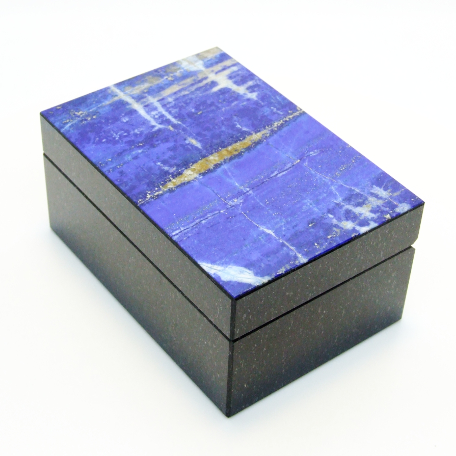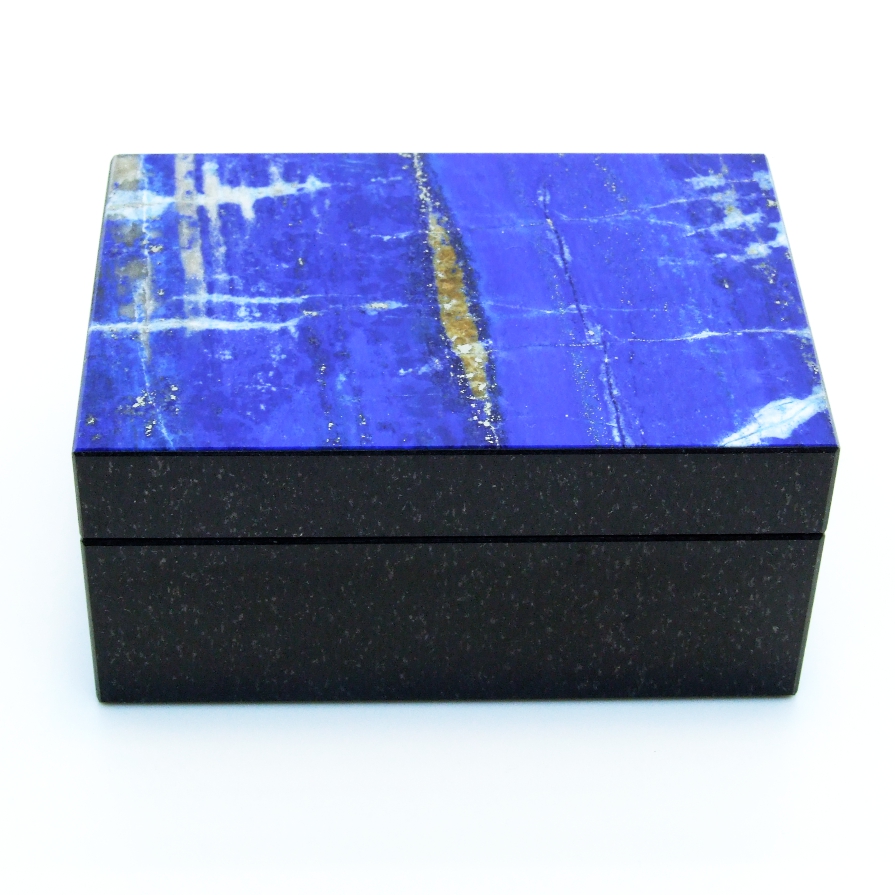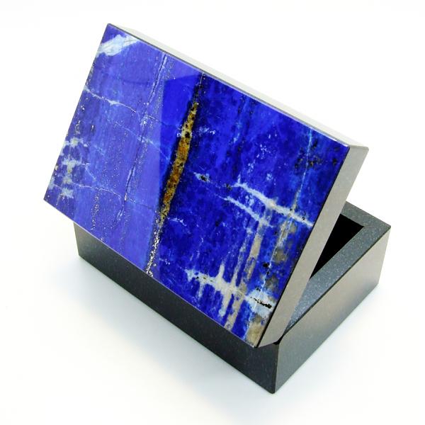 В разных странах и регионах добывают лазуриты разных оттенков. Но самыми ценными считаются лазуриты из Афганистана, которые еще называются "Бадахшанскими". Именно лазурит из Афганистана и стал украшением этой шкатулки, он называется "Ниили" — самый дорогой камень сочного синего цвета, обладающий золотистыми прожилками.
