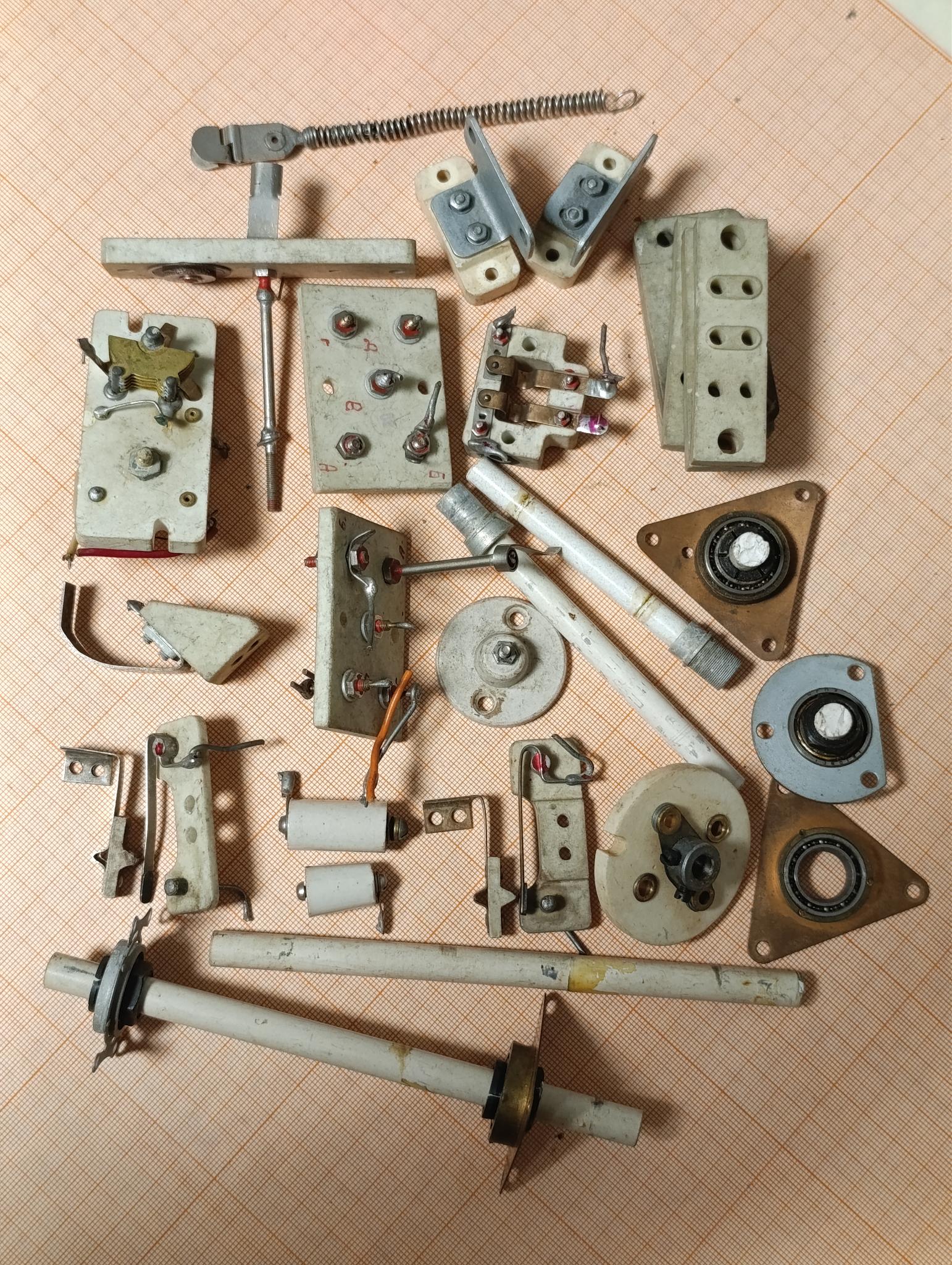 КотовоГибкое соединение осей Ф6 мм. на керамике. Контактные пары для подключения дополнительного конденсатора к С1 П-контура от конденсатора РСБ-5 - 2 пары. Керамические оси Ф8 и 9 мм.. 9-ти мм. на подшипниках. Насадка на ось КПЕ для механической шкалы.
