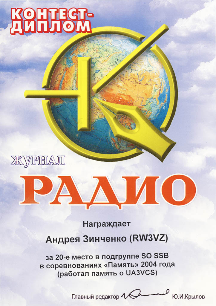 Работал в память своего учителя U3QD и в 2012 и 2013 годах.Обещанных дипломов нет.Посмотрим как в этом году будет.Хотя почти уверен повторится такая же ситуация.Печально...