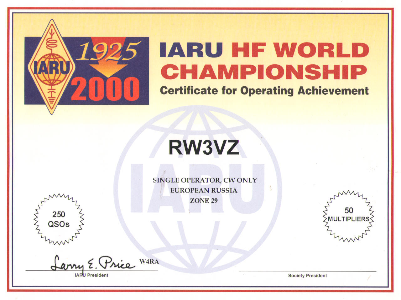Сертификаты участия - всем, кто имеет не менее 250 подтверждённых радиосвязей или множитель не менее 75.
