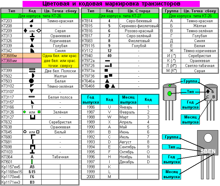QRZ.RU > Схемы и документация > Радиолюбителю-конструктору > Прочие схемы для конструкторов > Цветовая и кодовая маркировка транзисторов