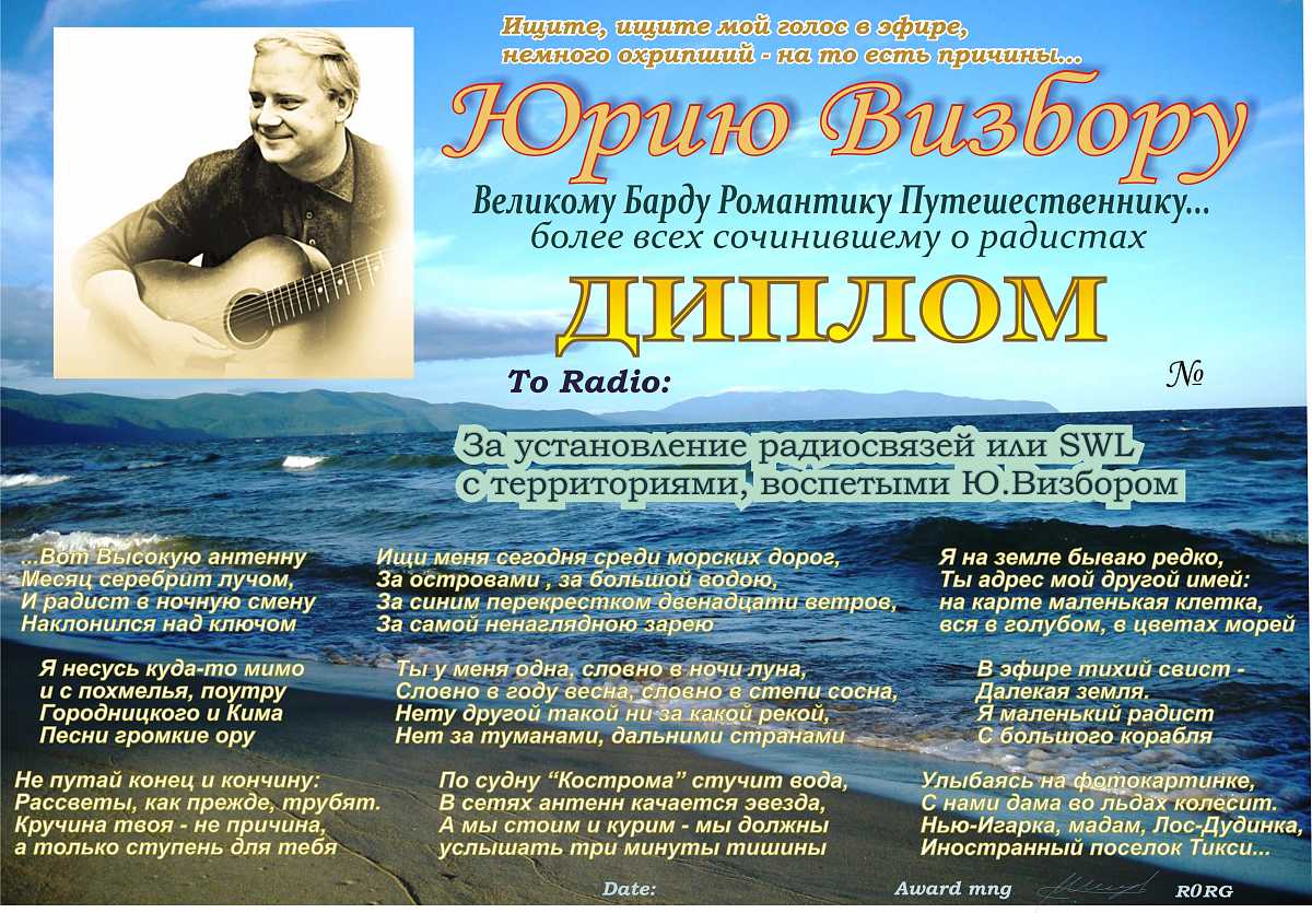 Диплом выдается за проведение радиосвязей (наблюдений), начиная с 10.06.2007 г. с радиостанциями, работающими с представительных (уровень городских, районных, областных, всероссийских) фестивалей бардовской песни (QSO на двух разных диапазонах или два QSO разными видами излучения); или в повседневной работе – за радиосвязи (SWL) с территориями, воспетыми Ю.Визбором по следующему перечню: Москва – Мурманск – ЗФИ – Архангельск – Игарка – Дудинка – Тикси – Чукотка – Курилы – Иркутск – Иркутская обл.- Бурятия – Тыва – Кольский п-ов – Карелия - Карачаево-Черкесия. Из указанного перечня в заявке должно быть не менее 15-ти территорий. За недостающие территории в зачет идут: QSO с горными экспедициями; Call/mm; Call/p; Call/m; прочие экспедиции. Диплом также присуждается радиостанциям, работавшим с фестивалей бардовской песни указанного уровня c предоставлением их QSL-карточки и фото с фестиваля. Нумерация дипломов по хронологии работы с фестивалей и в порядке поступления заявок по условию повседневной работы.