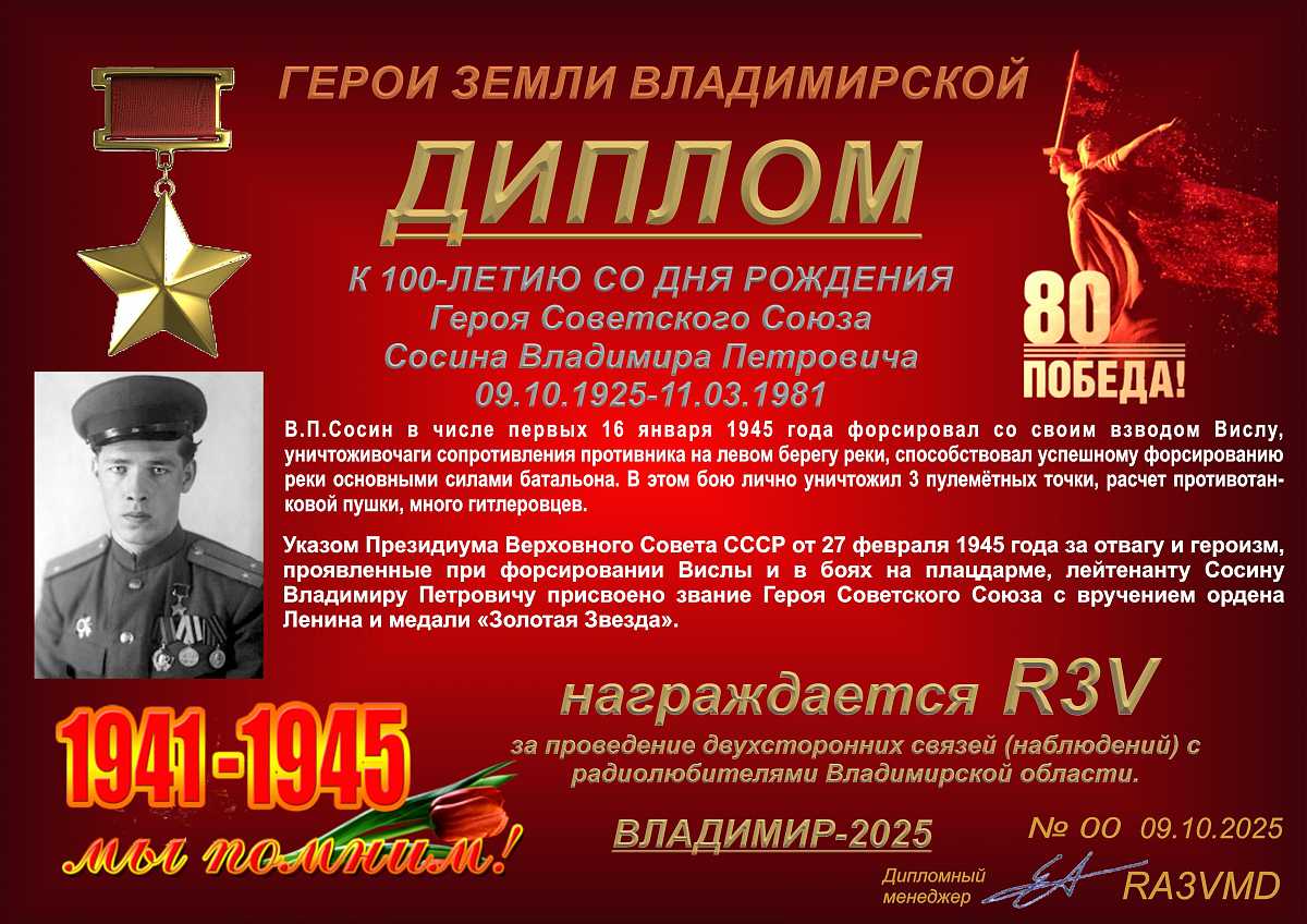 Диплом учрежден Владимирским областным радиоклубом и посвящен 100-летию со дня рождения Героя Советского Союза Сосина Владимира Петровича – командира пулемётного взвода 1281-го стрелкового ордена Александра Невского полка (60-я стрелковая Севская Краснознаменная ордена Суворова дивизия, 47-я армия, 1-й Белорусский фронт), лейтенанта.
