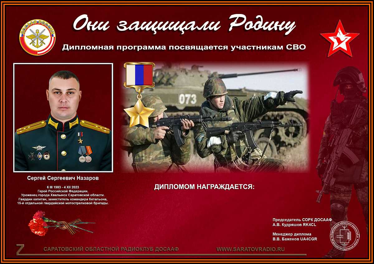 Приглашаются радиолюбители России, ближнего и дальнего зарубежья принять активное участие в акции памяти и скорби. В целях увековечивания памяти проявленного героизма при исполнении воинского долга участниками СВО, которые были призваны в ряды ВС РФ военкоматами Саратовской области, «Саратовский областной радиоклуб» РО ДОСААФ России по Саратовской области учредил дипломную программу «Они защищали Родину», в которую входит серия дипломов посвященных конкретному герою, или группе героев.