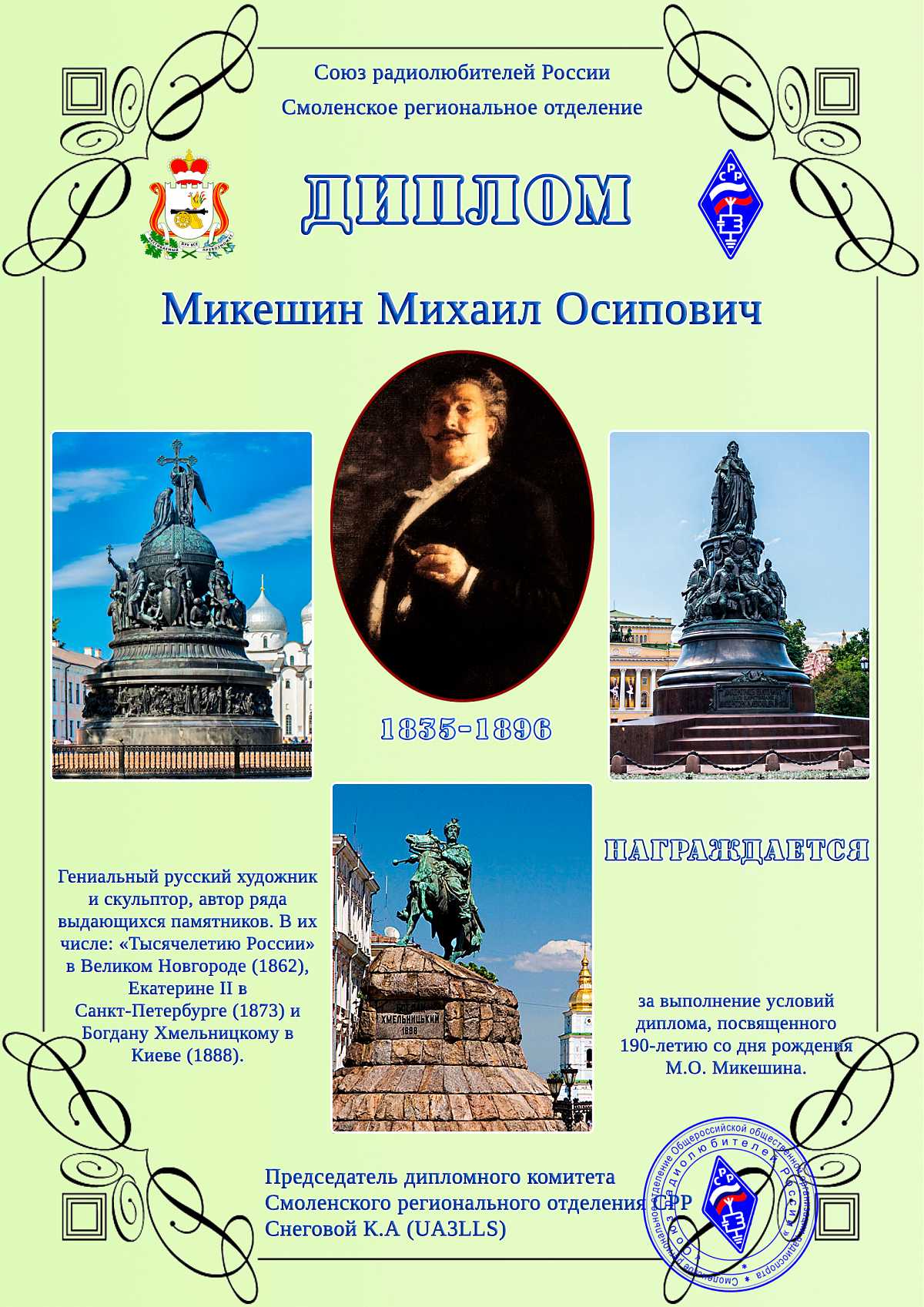 Диплом выдаётся радиолюбителям/наблюдателям России, стран СНГ и стран дальнего зарубежья за проведение QSO/SWL c любительскими радиостанциями с 21.01.2025 юбилейного года по 20.02.2030 года всеми видами излучения на всех любительских КВ и УКВ диапазонах. Необходимо набрать 190 очков.