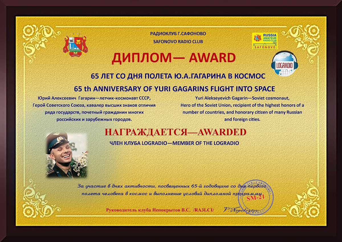 Диплом выдаётся радиолюбителям/наблюдателям России, стран СНГ и стран дальнего зарубежья за проведение QSO/SWL с 01 марта 2026 года по 16 апреля 2026 года c радиостанциями Смоленской, Саратовской, Московской областями и Республикой Казахстан, дающие по 5 очков всеми видами излучения на всех любительских КВ диапазонах.