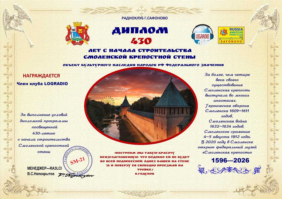 Диплом выдаётся радиолюбителям/наблюдателям членам клуба Logradio за проведение QSO/SWL с 01 марта 2026 года по 28 февраля 2027 года всеми видами излучения на всех любительских КВ диапазонах. Необходимо набрать 430 очков.