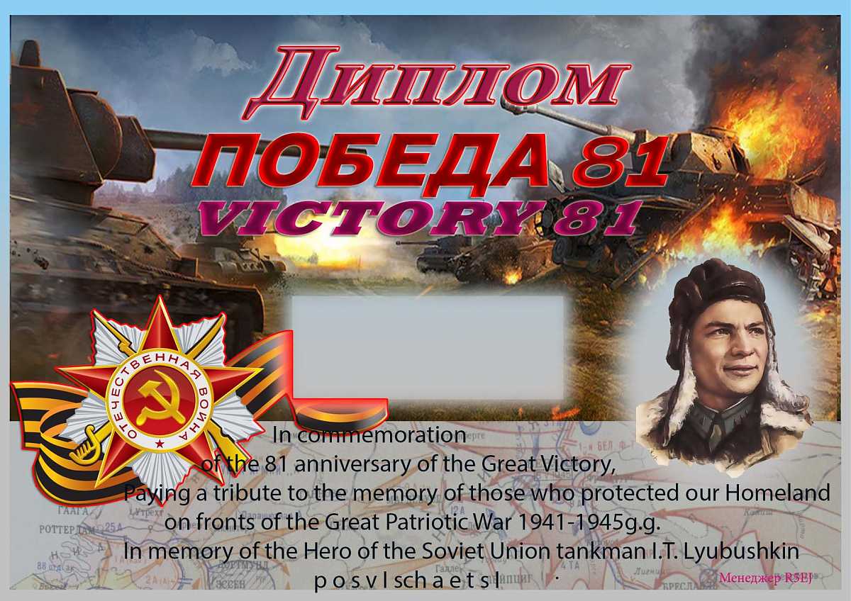 4. Для получения диплома необходимо провести 81 QSO c мемориальными радиостанциями RP81… и радиолюбителями других стран со спец.позывными этих стран, образованными в честь Дня Победы.
