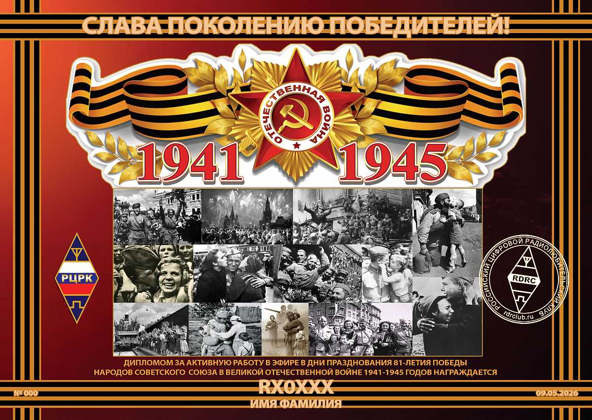 Диплом «Слава поколению победителей!» выдаётся соискателям на сайте наград РЦРК за радиосвязи (наблюдения) любыми видами модуляции на любых КВ и УКВ диапазонах с уникальными позывными любительских радиостанций не менее чем 7 стран, входивших республиками в единое государство Союз Советских Социалистических Республик, имеющих в позывных сигналах следующие первые буквы префиксов: 4J, 4K, 4L, EK, EM, EN, EO, ER, ES, EU, EV, EW, EX, EY, EZ, LY, R, RA-RZ, U, UA-UZ, YL. Великая Отечественная Война продолжалась 1418 дней и ночей с 22 июня 1941 по 9 мая 1945 года. Для выполнения условий диплома необходимо набрать 1418 очков за радиосвязи в период с 1 по 31 мая 2026 года.