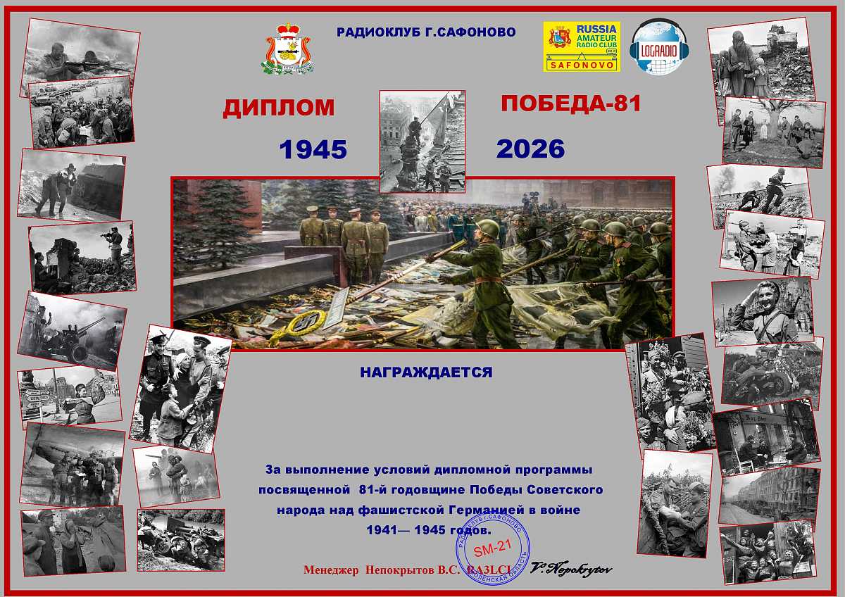 Диплом выдаётся радиолюбителям /наблюдателям/ за проведение QSO/SWL с 01 мая 2026 года по 10 мая 2026 года всеми видами излучения на всех любительских КВ диапазонах. Необходимо набрать 81очко.