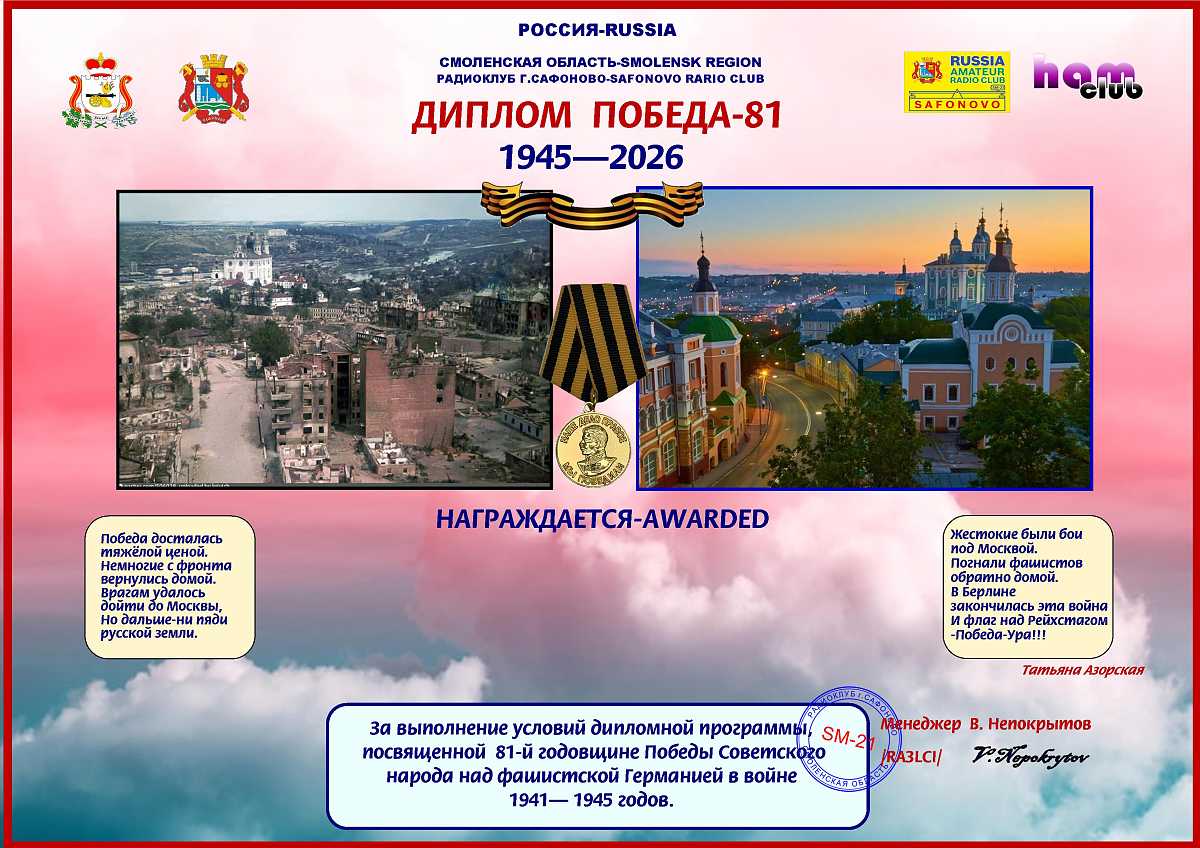 Диплом выдаётся радиолюбителям /наблюдателям/ за проведение QSO/SWL с 01 мая 2026 года по 10 мая 2026 года всеми видами излучения на всех любительских КВ диапазонах. Необходимо набрать 81 очко.