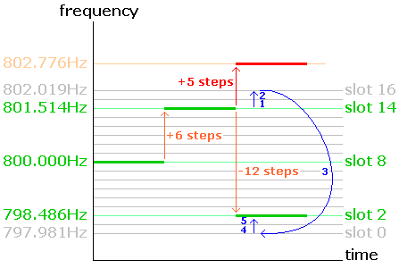 В двухчастотном непрерывном режиме (DFCW) элемент "длительность" заменен новым элементом, которого нет в классическом CW - "частотой". Так что теперь точки и тире имеют одинаковую длительность и передаются на разных частотах. Из-за сдвига частот убирается пустое пространство между точками/тире и сам характер пустого пространства редуцируется до длительности точки/тире.