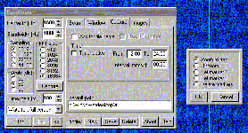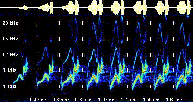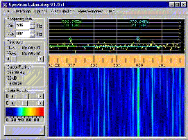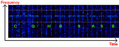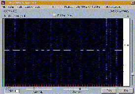 Результат работы программы анализа входных сигналов представляется в графическом виде, где по осям ординат представляются время и частота. Если время отложено по вертикали, то такой экран называется waterfall display (дисплей водопада), если же время представляет горизонтальная ось - тогда экран будет называться curtain display (дисплей завесы). Все это может показаться непонятным, и внизу показан рисунок в качестве примера - дисплей завесы.