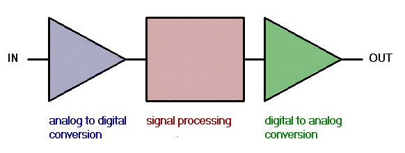 DSP технология предполагает, что входной аналоговый сигнал будет преобразован в цифровую форму, обработан и затем вновь преобразован в аналоговую форму на выходе. Данный процесс выполняется при помощи Аналого-цифрового преобразователя (АЦП).