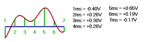 При аналого-цифровом преобразовании автоматически, в известном временном интервале производится измерение мгновенных значений амплитуд определенное число раз, называемое сэмплированием сигнала. В результате на выходе получается серия измерений где в каждом из них мы знаем амплитуду сигнала и точное время, когда это было измерено.