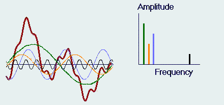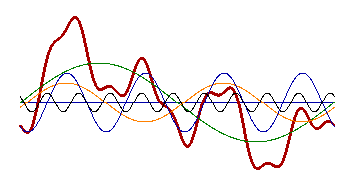 На рисунке выше, красной линией показан комплексный сигнал, который равняется сумме зеленой, синей, желтой и белой синусоид. Математические уравнения преобразования Фурье довольно сложны, но если вы интересуетесь этими вопросами, можно посмотреть следующие ссылки на вэб ресурсы.
