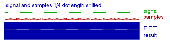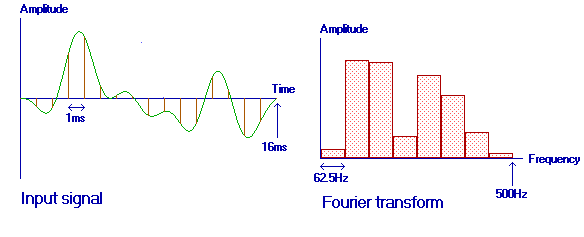 На рисунке выше показан простой пример. Преобразование Фурье состоит из 16 сэмплов (выборок) с дискретизацией в 1 мс. Результат состоит из 8 синусоид каждая из которых представляет канал шириной в 62,5 Гц в полосе частот от 0 до 500 Гц.