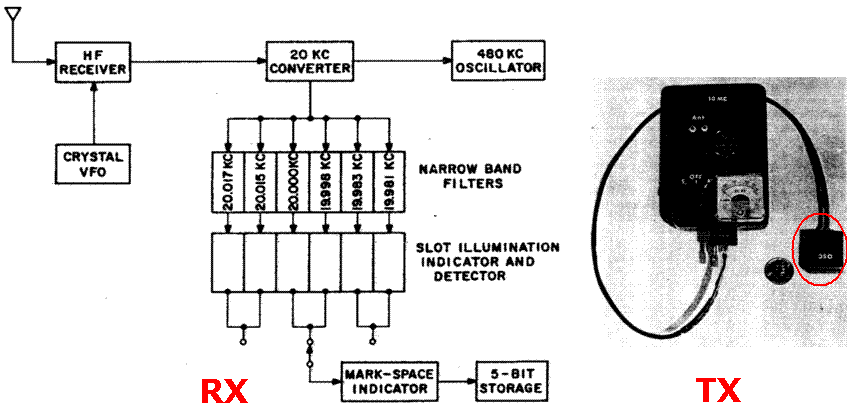 Блок-диаграмма приемника показана слева. Это базовая схема в коммерческом приемнике с 1-й ПЧ 500 кГц. Далее эта частота преобразовывалась в ПЧ = 20 кГц и подавалась на ряд из 6-ти узкополосных фильтров охватывающих полосу частот от 19981 Гц to 20017 Гц.