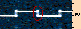 При скорости 3 сек. на точку этот вызов (CQ) в режиме QRSS будет иметь длительность 5 мин. 30 сек, а в режиме DFCW - только 1 мин. 54 сек.. Скоростное преимущество DFCW по отношению к QRSS может проявляться двояко: уменьшая длительность проводимого QSO или увеличивая возможную точечную длину, и уменьшая при этом полосу пропускания. Это означает, что при равной длительности QRSS и DFCW сеанса радиосвязи, в последнем случае можно получить улучшение соотношения сигнал/шум (SNR) на 4 - 5 дб. Следующий рисунок показывает практическое изображение сигнала DFCW.