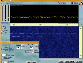 Картинка выше показывает сигнал станции HB9ASB, который не может приниматься "вживую на слух" из-за высокого уровня атмосферных помех (QRN). Вертикальные линии на экране показывают статические возмущения атмосферы. Несколько интересных коллекций захвата картинок можно посмотреть на следующих страницах: DK8KW, G3XDV, OK1FIG and NL9222