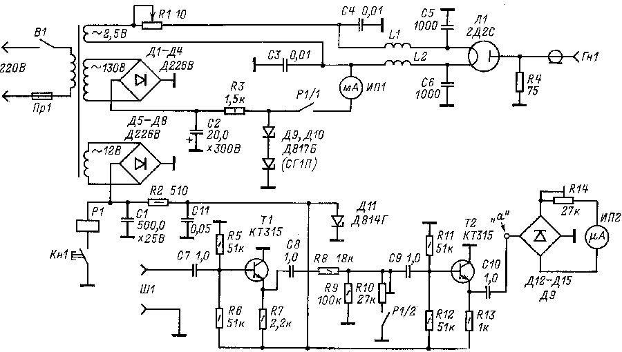 Дроссели L1 и L2 имеют по 20 витков провода ПЭВ2-0,64. Диаметр каркаса 4—5 мм. Прибор ИП1 — миллиамперметр со шкалой 5—10 мА, ИП2 — микроамперметр 50—200 мкА. Реле Р1 типа РЭС-9. Вместо диодов Д9, Д10 можно применить газоразрядный стабилитрон СГ1П.
