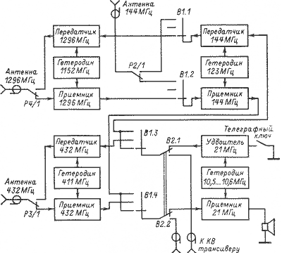 Радиостанция может работать как автономно (только в телеграфном режиме), так и совместно с коротковолновым трансивером. И в том и в другом случае обеспечивается трансиверный режим работы, т. е. происходит автоматическое совмещение частот приема и передачи. Функциональная схема радиостанции показана на рис. 2. Радиостанция состоит из четырех основных блоков: трех трансвертеров соответственно на диапазоны 144, 432 и 1296 МГц и маломощного телеграфного трансивера на диапазон 21 МГц. Название “трансвертер” происходит от двух английских слов “transmitter” — передатчик, “converter” — конвертер и означает, что данное устройство предназначено для преобразования частоты не только в режиме приема, но и в режиме передачи. Совпадение частот приема и передачи обеспечивается тем, что в обоих режимах используется один и тот же опорный гетеродин. Таким образом, каждый трансвертер можно подразделить на три основные части: приемный тракт, передающий тракт и общий гетеродин. Именно в таком виде показаны трансвертеры на функциональной схеме.