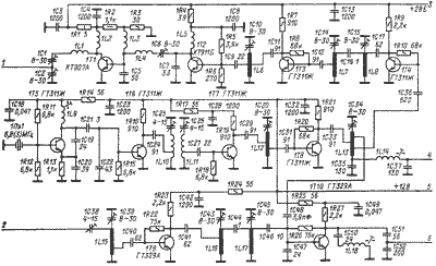 Возвратимся к принципиальной схеме. С выхода полосового фильтра сигнал поступает на последний умножитель. Умножитель собран на транзисторе 1Т7 по схеме с общим эмиттером и не имеет каких-либо особенностей. В качестве колебательной системы применен четвертьволновый резонатор, укороченный емкостью Далее сигнал усиливается транзистором 1Т8 до амплитуды, необходимой для нормальной работы смесителей приемного и передающего трактов. Выходная частота гетеродина 123 МГц.