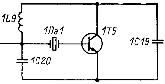 Гетеродин построен по традиционной схеме, состоящей из кварцевого автогенератора и цепочки умножителей. Для снижения уровня помех на паразитных частотах в выходном сигнале гетеродина применен способ возбуждения кварцевого резонатора на третьей механической гармонике. Задающий генератор собран по емкостной трехточечной схеме с кварцевым резонатором в цепи обратной связи. Это наглядно видно, если изобразить схему автогенератора в несколько измененном виде, как показано на рис. 4.