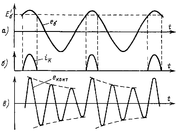 На рисунке представлены графики, поясняющие механизм работы умножителя. График на рис. 5, а показывает форму напряжения на базе транзистора. В тот момент, когда это напряжение достигает границы открывания транзистора, появляется коллекторный ток (рис. 5,б). Длительность импульсов, протекающих через транзистор, зависит от амплитуды напряжения на базе и напряжения автосмещения. Импульсы коллекторного тока ударно возбуждают колебательный контур, включенный в коллекторную цепь. После окончания импульса дальнейшие колебания продолжаются только благодаря энергии, запасенной в контуре (рис. 5, в). В силу того, что в реальном контуре имеются потери и добротность его не бесконечна, амплитуда колебаний уменьшается по экспоненциальному закону. Это приводит к появлению на выходе умножителя амплитудной модуляции с частотой входных импульсов. Подобная модуляция без труда сохраняется во всех дальнейших ступенях умножения, так как чем выше частота, тем шире полоса пропускания контуров. В результате в выходном сигнале гетеродина появляются мощные составляющие, отстоящие от центральной частоты на частоту модуляции т е. в нашем случае на частоту кварцевого генератора. По этой причине следует по возможности избегать в гетеродине высоких степеней умножения. Если к спектральной чистоте сигнала гетеродина предъявляются повышенные требования, то иногда применяют двухтактную схему удвоения частоты (рис. 6).