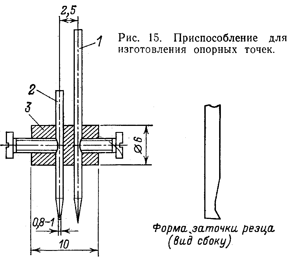 Приспособление состоит из центральной иглы 1, миниатюрного резца 2 и крепежной детали. Игла и резец изготовлены из отслуживших свой срок зубоврачебных боров. Для заточки удобно воспользоваться небольшим абразивным камнем или алмазным надфилем. Крепежная деталь изготовлена из стальной втулки 3 диаметром 6 мм. Боры вставлены в два отверстия, просверленные во втулке, и закреплены двумя винтами МЗ. Для надежного крепления боров на их боковых поверхностях желательно снять фаску. Хвостовик иглы должен быть длиннее хвостовика резца для того, чтобы его можно было зажать в патрон сверлильного станка или дрели. Однако не представляет большого труда сделать кольцевые канавки вручную. Для этого удобно зажать приспособление в ручные ювелирные тиски. Не следует прикладывать излишнее усилие и стараться прорезать канавку за один заход, так как это ведет к появлению задиров. Резец должен быть заточен так, чтобы ширина канавки равнялась 0,5—0,8 мм. При этом диаметр опорного кружка должен составлять около 5 мм. Конечно, данное приспособление можно изготовить любым другим образом. Можно использовать специально заточенное сверло или в простейшем случае измеритель из чертежной готовальни. Одну из иголок надо перевернуть и заточить в виде резца. Для придания большей жесткости полезно стянуть ножки измерителя проволочным бандажом.