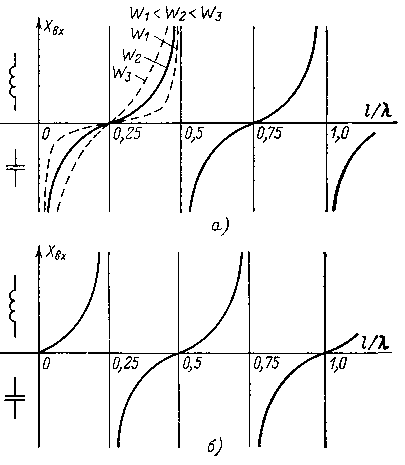 Видно, что при длине разомкнутой линии менее 1/4 длины волны входное реактивное сопротивление линии отрицательно, т. е. носит емкостный характер. Такой отрезок линии можно использовать как подстроечный конденсатор. Емкость конденсатора можно регулировать изменением расстояния между линией и землей. Если размер плоской линии менее 1/8 длины волны, ее емкость с достаточной точностью описывается формулой плоского конденсатора C = 0,9 S/d, здесь С — емкость в пикофарадах; S — площадь линии в квадратных сантиметрах; d — зазор между линией и землей в миллиметрах.