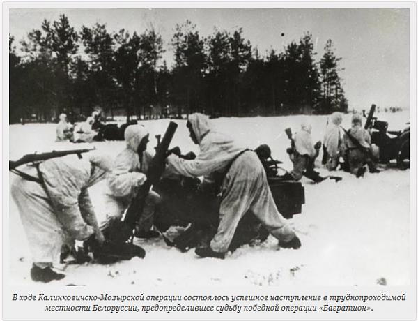 Войска Белорусского фронта в результате умелого обходного маневра 14 января штурмом овладели областным центром Беларуси городом Мозырь и крупным железнодорожным узлом городом Калинковичи - важным опорным пунктом обороны немцев на полесском направлении.
