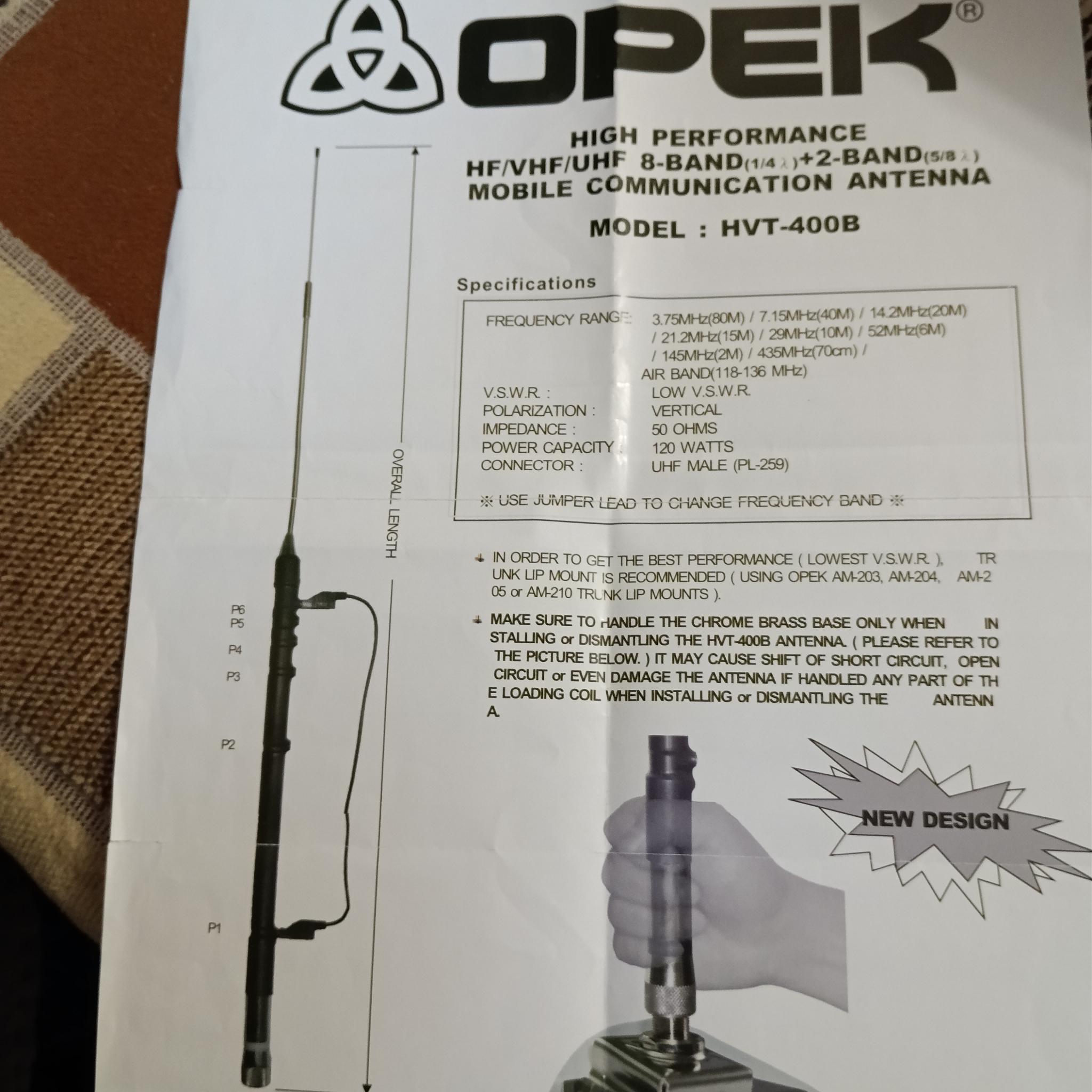 ЕкатеринбургМобильная LB антенна OPEK VH-1213 на 32 - 54 МГц Технические характеристики Диапазон частот, МГц 32 - 54 МГц Полоса на уровне КСВ 1 - 1, 5 -3 МГц Макс. Мощность 200 Вт Длина штыря 1245 мм Материал штыря нержавеющая сталь Тип крепления NMO Сопротивление 50 Ом