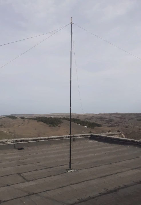 Антенная мачта армейского образца времен СССР из 6 секций разделенных фарфоровыми изоляторами. Растяжки грозоразрядники в комплекте