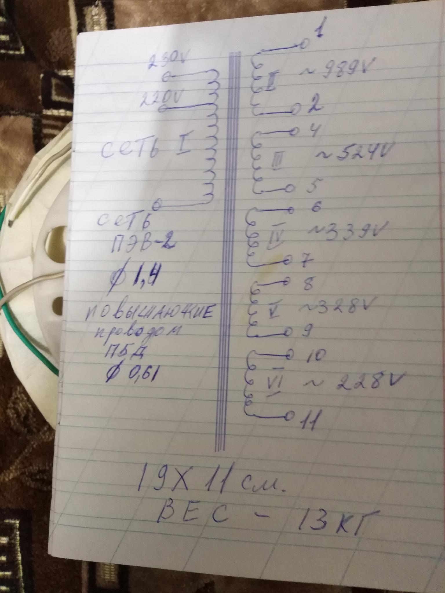 Миасспродам силовой трансформатор для запитки экранного и анодного напряжения. габаритная мощность 900 ват. моточные данные на фото. запитка гу-81 или две гк-71.