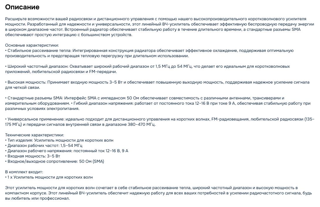 ВоронежНовый усилитель мощности 430-440 МГц 400 Вт Виды излучения SSB, CW, DIGI, RTTY, ЕМЕ и др. Входная мощность 10 Вт Выходная мощность 400 Вт максимум (SSB/CW, DIGI, RTTY и др. ) - зависит от напряжения питания Максимальный КСВ в антенне 1. 5: 1 Напряжение питания +30 … +50В Ток потребления 15А ma ...