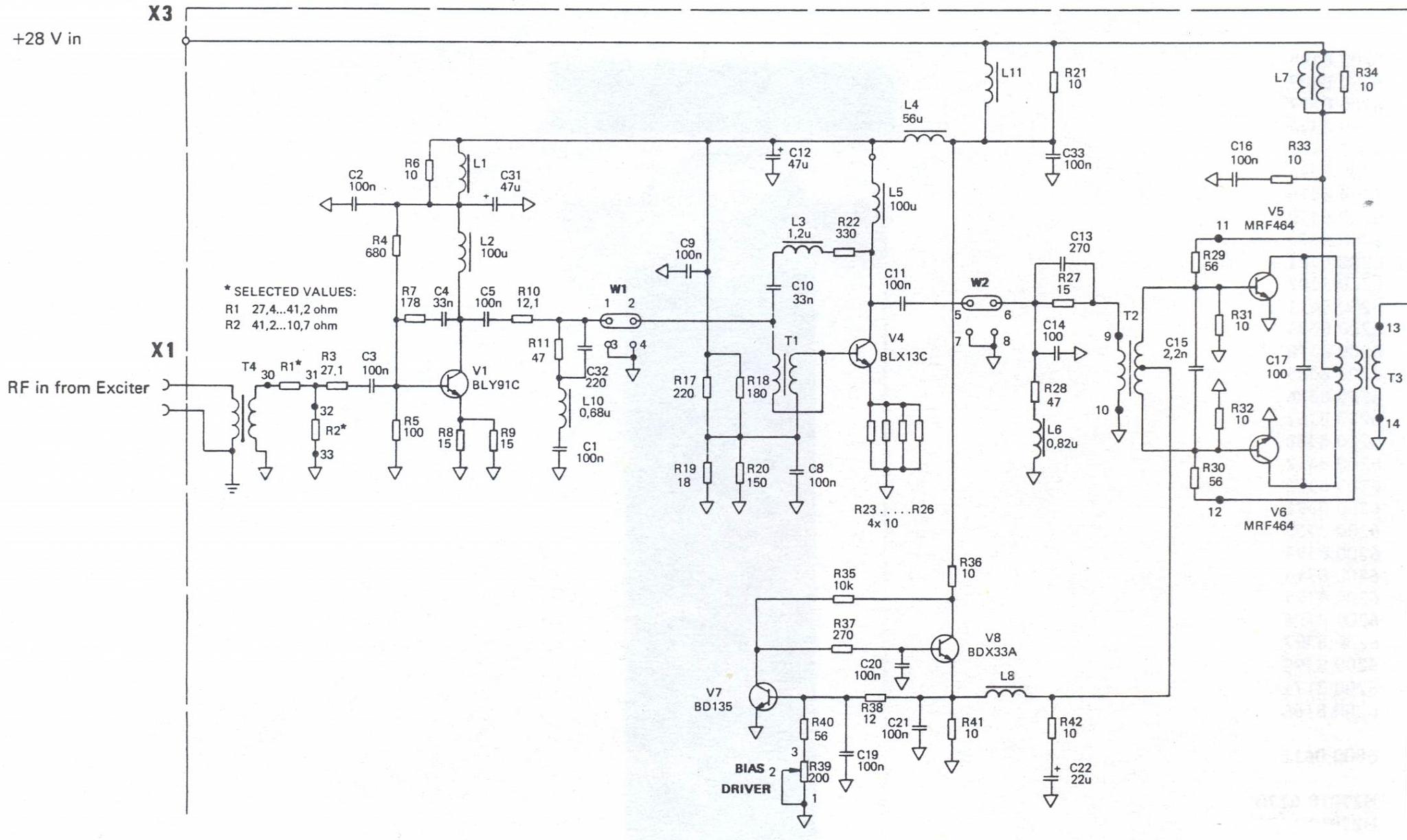 СимферопольПлата редназначена для деления входной мощности в 4раза, максимально подаваемая мощность на вход этой платы до 300вт. Далее поделенная мощность поступает на оконечные усилители мощности в диапазоне 1, 5.. .. 30мГц,. Эта плата входит в состав 1кВт усилителя мощности, схема имеется